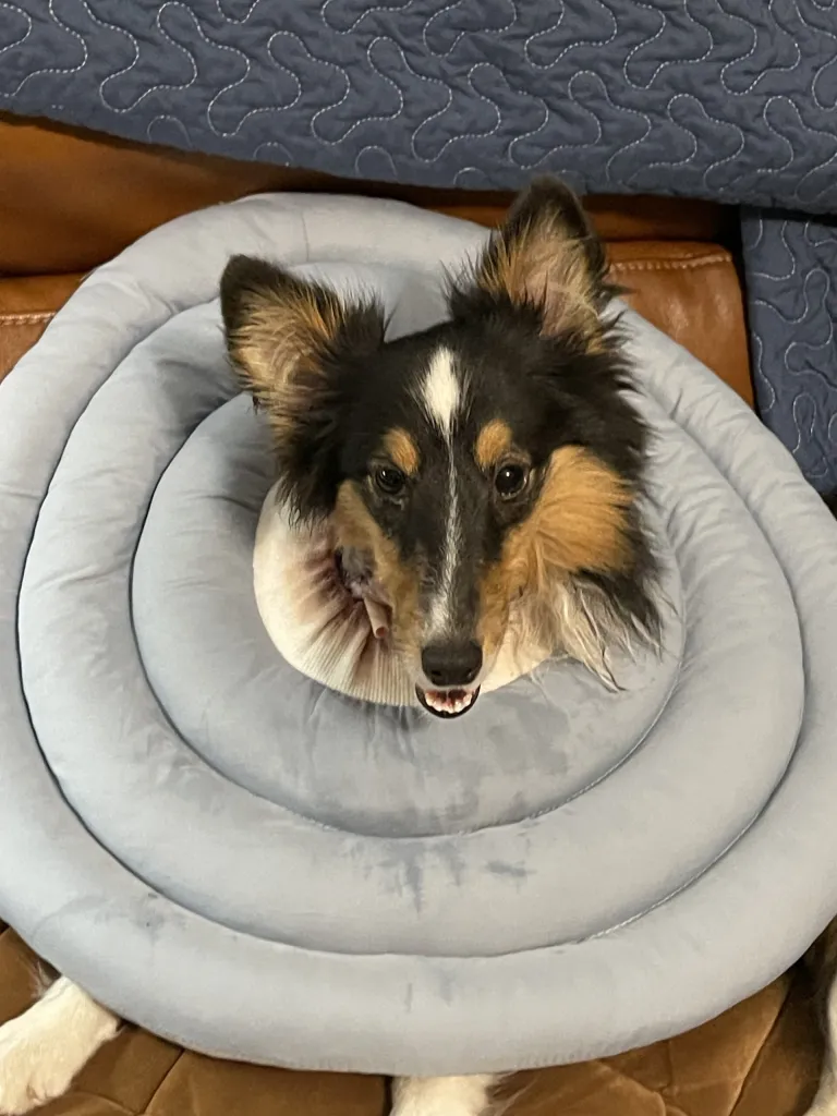 Gizmo requires daily wound care to keep the infection from getting any worse and to help the wound heal so he can get back to running and playing like a 7 month old should and not be wearing this cone. Many versions of cone were tried but this one seemed to work the best to keep him from scratching it.