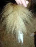 Notice the “rat tail” on the left. Sparse hair and dry fur. You can actually see the tip of her bare tail peeking out of the white fur.